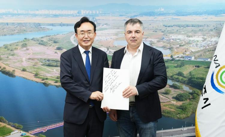 À±º´Å ³ªÁÖ½ÃÀåÀº 16ÀÏ ¡®³ªÁֱ۷ιú¿¡³ÊÁöÆ÷·³ 2025¡¯ ±âÁ¶¿¬¼³À» À§ÇØ ³ªÁֽø¦ ¹æ¹®ÇÑ 2010³â ³ëº§¹°¸®Çлó ¼ö»óÀÚ ÄܽºÅºÆ¾ ³ëº¸¼¿·ÎÇÁ ±³¼ö(¿À¸¥ÂÊ)¿Í ¸¸³ª ȯ´ãÇß´Ù.(»çÁø=³ªÁÖ½Ã)