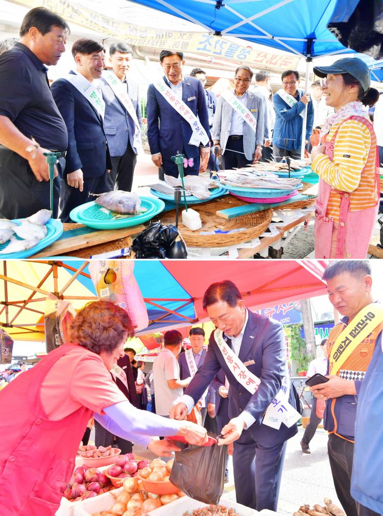 (À§ »çÁø)김한종 장성군수(¿ÞÂÊ ³× ¹øÂ°)¿Í Áö¿ª±¸ À̰³È£ ±¹È¸ÀÇ¿ø, ½É¹Î¼· À强±ºÀÇȸ ÀÇÀå, µµ¡¤±ºÀÇ¿ø, ±â°üÀå, »çȸ´ÜüÀå µî 200¿© ¸íÀÌ Áö³´Þ 29일 황룡전통시장 À庸±â Çà»ç¸¦ ÁøÇàÇϸç Áö¿ª°æÁ¦ »ì¸®±â¿¡ µ¿ÂüÇϰí ÀÖ´Ù. / (¾Æ·¡ »çÁø)김한종 장성군수°¡ Áö³´Þ 29일 Ãß¼® ¸íÀý¸ÂÀÌ ÀüÅë½ÃÀå À庸±â Çà»ç¿¡¼ Ãß¼®¿ëǰÀ» ±¸ÀÔÇÏ¸ç »óÀΰú ´ëȸ¦ ³ª´©°í ÀÖ´Ù.(»çÁø=À强±º)