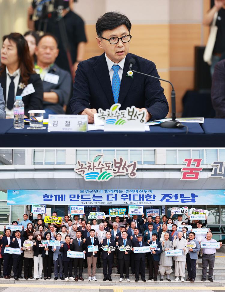 (À§ »çÁø)±èö¿ì º¸¼º±º¼ö°¡ ¡®2025³â Àü¶ó³²µµ Á¤Ã¥ºñÀüÅõ¾î¡¯¿¡¼ ȯ¿µ»ç¸¦ Çϰí ÀÖ´Ù. / (¾Æ·¡ »çÁø)±èö¿ì º¸¼º±º¼ö, ±è¿µ·Ï Àü³²µµÁö»ç¸¦ ºñ·ÔÇÑ º¸¼º±º Àü¶ó³²µµ Á¤Ã¥ºñÀüÅõ¾î Âü¼®ÀÚµéÀÌ ÈûÂù º¸¼ºÀÇ ¹Ì·¡¸¦ ÇâÇÑ ÀÇÁö¸¦ ´ÙÁö°í ÀÖ´Ù.(»çÁø=º¸¼º±º)