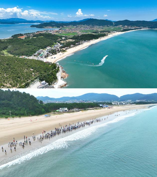 ¿Ïµµ±º, ¡®´ëÇѹα¹ Ä¡À¯±æ 1È£ ½ÅÁö ¸í»ç½Ê¸®¡¯ ¸Ç¹ß °È±â ¸í¼Ò·Î ¿ì¶Ò. »çÁøÀº 대한민국 맨발 걷기 치유길 1호인 신지 명사십리 전경(À§)°ú 지난 7월 열린 2025 해양치유 전국 맨발 걷기 축제 ¸ð½À(¾Æ·¡) (»çÁø=¿Ïµµ±º)