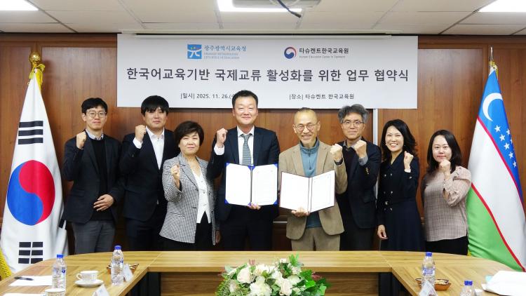 ±¤Áֽñ³À°Ã»°ú ¿ìÁŰ½ºÅº ¼ÒÀç Ÿ½´ÄËÆ® Çѱ¹±³À°¿øÀÌ 26ÀÏ Å¸½´ÄËÆ® Çѱ¹±³À°¿ø¿¡¼ ÁøÇàÇÑ ¡®±¹Á¦±³À°Çù·Â ¾÷¹«Çù¾à½Ä¡¯¿¡¼ Ãֽº¹ ±¤Áֽñ³À°Ã» ºÎ±³À°°¨(¿ÞÂÊ 5¹øÂ°)°ú ÀÌ¿µ¿õ Çѱ¹±³À°¿ø ¿øÀå(¿ÞÂÊ 4¹øÂ°)ÀÌ Çù¾àÀ» ¸¶Ä£ ÈÄ ±â³ä»çÁøÀ» ÃÔ¿µÇϰí ÀÖ´Ù.(»çÁø=±¤Áֽñ³À°Ã»)