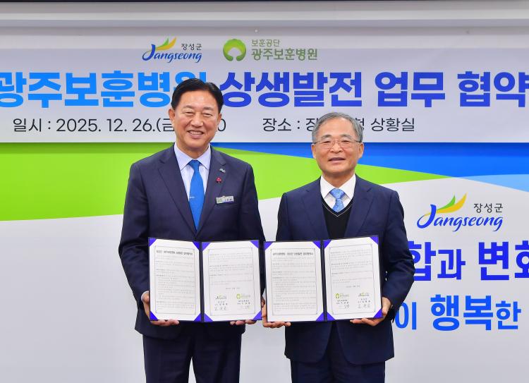 장성군이 지난 26일 광주보훈병원과 군민 건강 증진 및 지역 발전을 위한 업무협약을 체결했다. (¿ÞÂʺÎÅÍ)김한종 장성군수, 이삼용 광주보훈병원 원장 (»çÁø=À强±º)