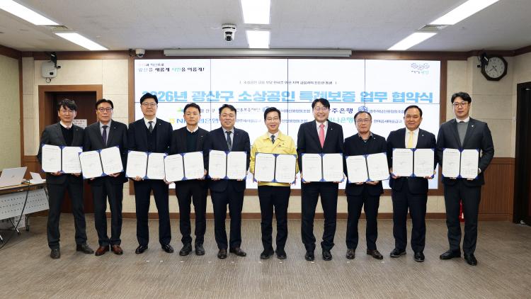 [±¤ÁÖÀü³²´º½º/±èº´¼ö ±âÀÚ] ±¤Áֽà ±¤»ê±¸(±¸Ã»Àå ¹Úº´±Ô)°¡ Áö³ 6ÀÏ ±¸Ã» 2Ãþ ȸÀǽǿ¡¼ ±¤Áֽſ뺸ÁõÀç´Ü(ÀÌ»çÀå ¿°±Ô¼Û), Áö¿ª ±ÝÀ¶±â°ü 8°³¼Ò(¡â±¤ÁÖ¾î·æ½ÅÇù¡¤±¤ÁÖÇϳ²½ÅÇù¡¤¿ì»ê½ÅÇù ¡â±¤ÁÖÀºÇà ¡âÇϳªÀºÇà ¡â³óÇù¡â¼±¤ÁÖ»õ¸¶À»±Ý°í¡¤ÇѸ¶À½»õ¸¶À»±Ý°í)¿Í ÇÔ²² ¡®2026³â ±¤»ê±¸ ¼Ò»ó°øÀΠƯ·Êº¸Áõ ¾÷¹«Çù¾à¡¯À» ü°áÇß´Ù.