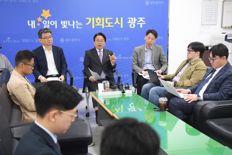 °±âÁ¤ ±¤ÁÖ±¤¿ª½ÃÀåÀÌ 21ÀÏ ±âÀÚÂ÷´ãȸ¿¡¼ ±¤ÁÖ¡¤Àü³² ÅëÇÕÀ» ¾ÕµÎ°í Àӱ⠳» ¸¶¹«¸®ÇÒ 10°¡Áö ÁÖ¿ä ½ÃÁ¤ °úÁ¦¿¡ ´ëÇØ ¼³¸íÇϰí ÀÖ´Ù.(»çÁø=±¤ÁÖ±¤¿ª½Ã)